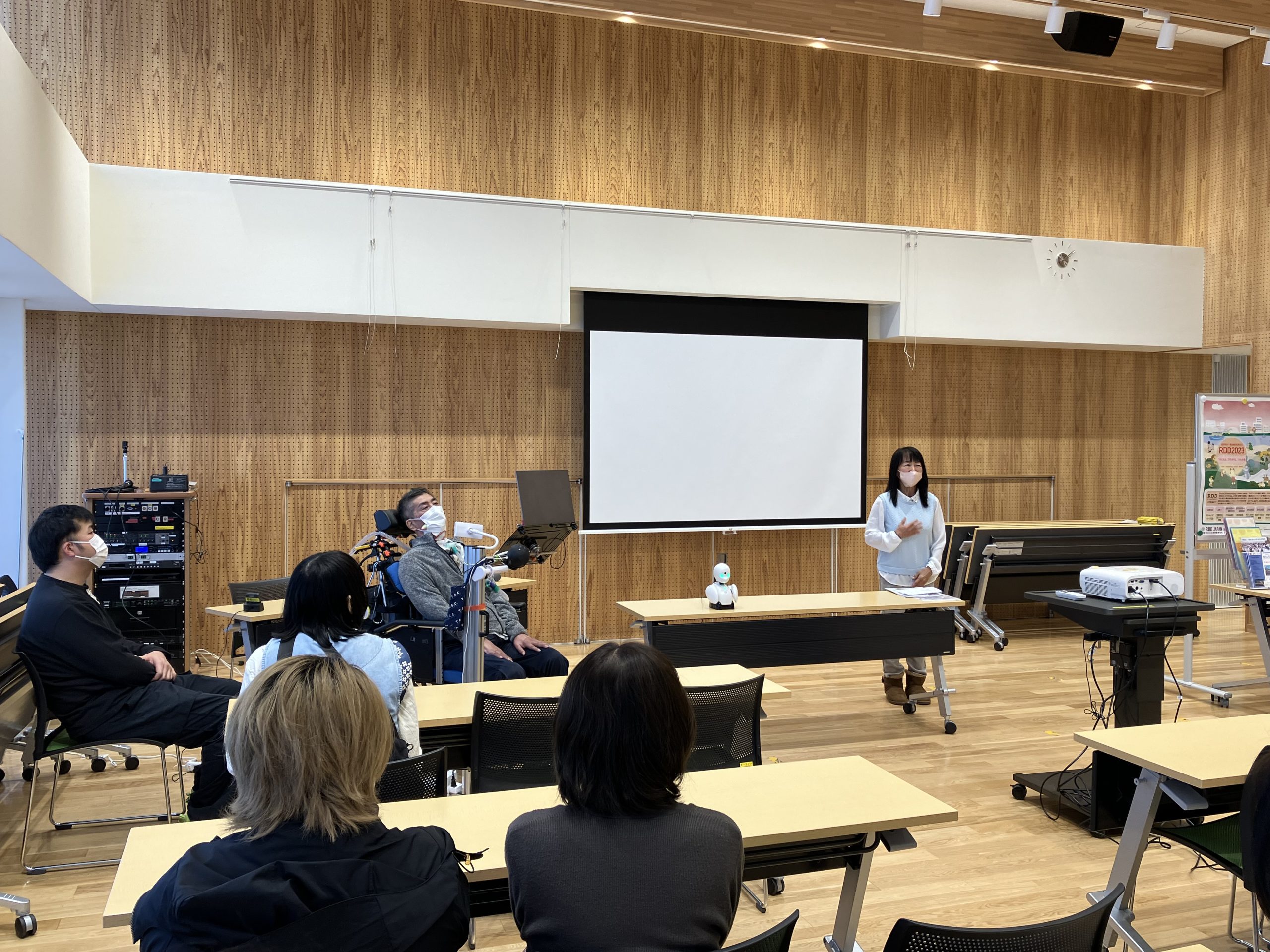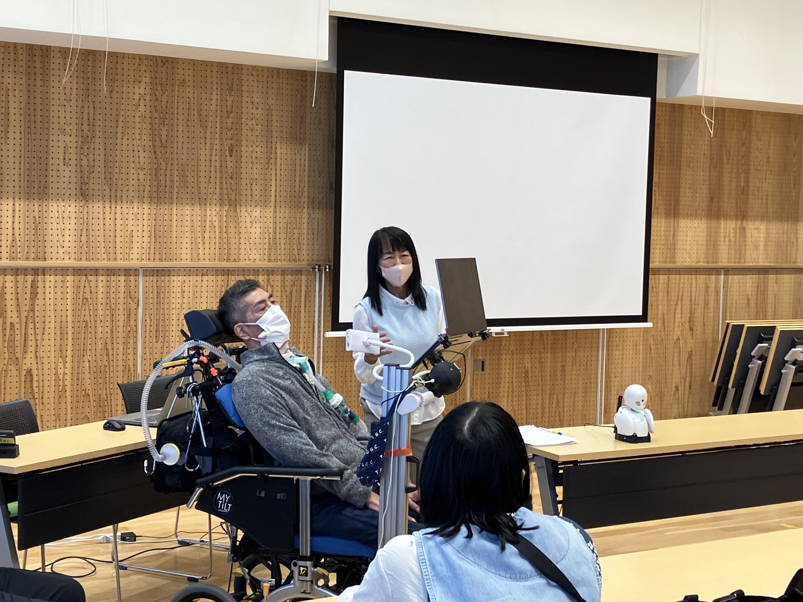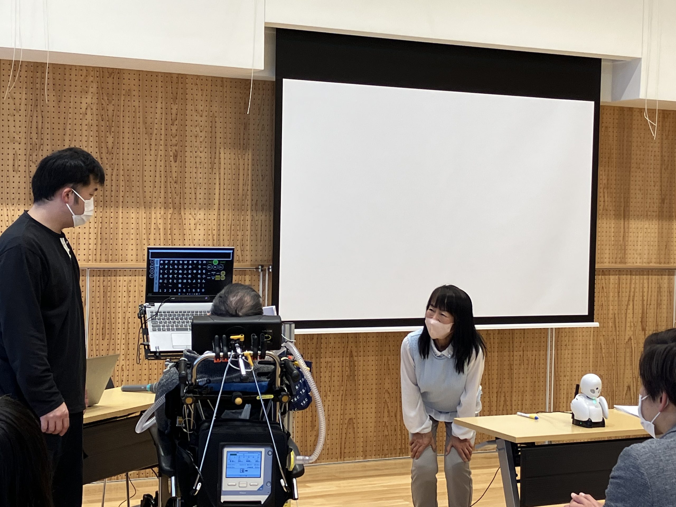 ALS患者の岡内さんに、分身ロボットOriHimeを使って患者の思いを講演いただいた。