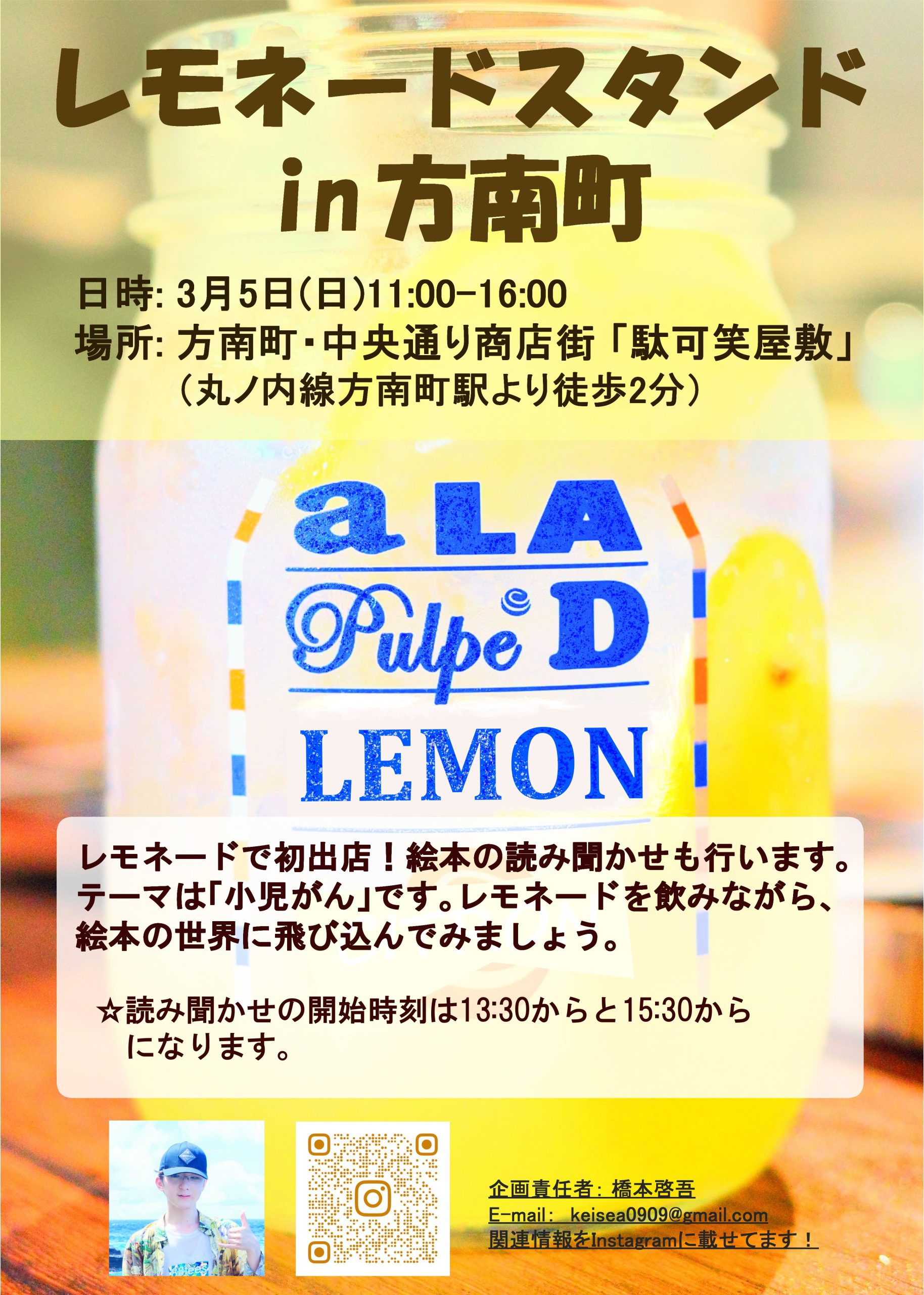 ホット/アイスのレモネードを200円/杯で提供します。(絵本読み聞かせを含む)イベントへの参加自体は無料です。