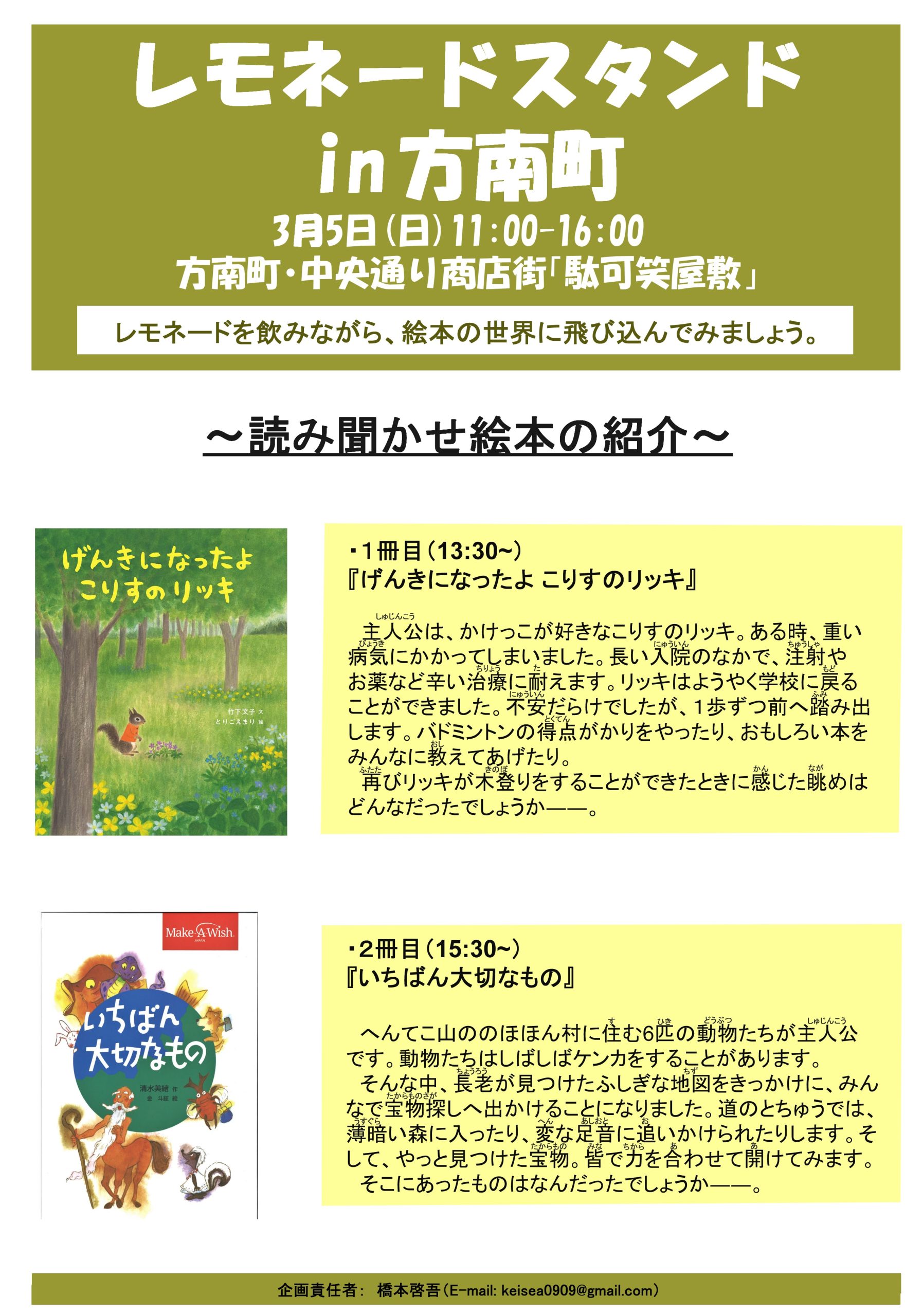 - 「駄可笑屋敷」でレモネードの販売と絵本の読み聞かせをします。