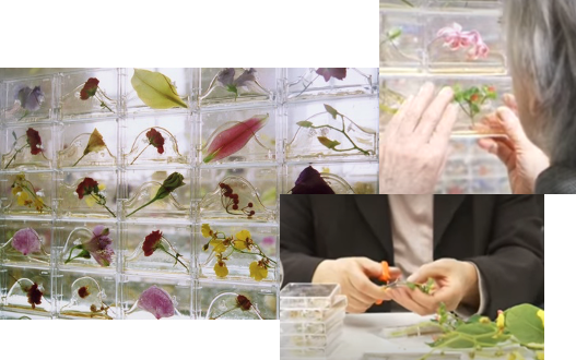 樹脂の入った音楽用カセットテープの中に、ドライフラワーや造花を入れ、会場の大きな窓に重ねていきます。さまざまないろ・かたちの花が会場を彩ります。
